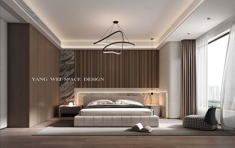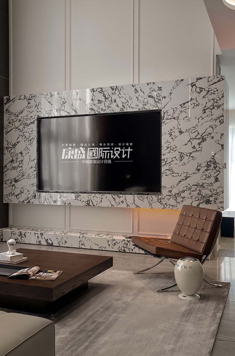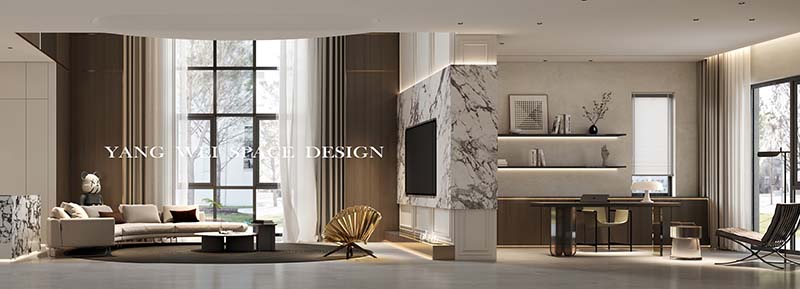 On the front is a marble TV backdrop, whose natural texture is smooth and full of tension, showing a low-key luxury texture in simplicity. The design lines of the wall are integrated with the whole space, making the living room a dual focus of vision and function. Floor-to-ceiling windows bring the natural beauty of the outdoors indoors. During the day, there is plenty of light, and the greenery and blue sky reflect a bright and open landscape; At night, the lights outside the window complement the interior lighting, creating a peaceful and welcoming atmosphere.