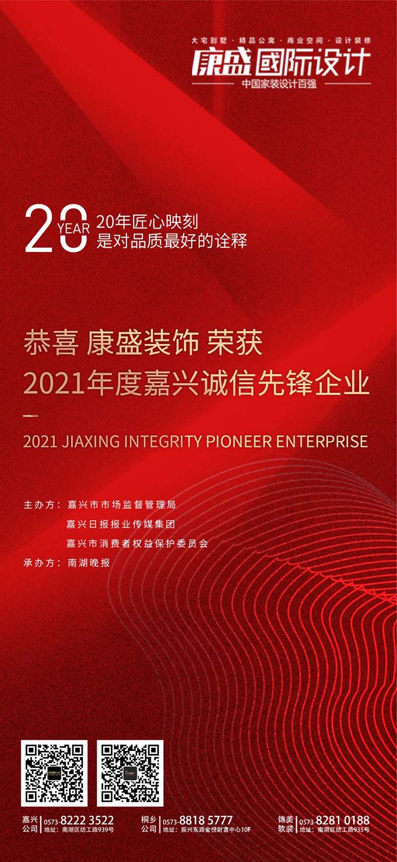 3月15日,由嘉興市市場監(jiān)督管理局、嘉興市消費(fèi)者權(quán)益保護(hù)委員會和嘉興日報報業(yè)傳媒集團(tuán)共同主辦的“3·15消費(fèi)者權(quán)益保護(hù)云發(fā)布會”上,康盛裝飾榮獲“2021年度嘉興誠信先鋒企業(yè)”。
