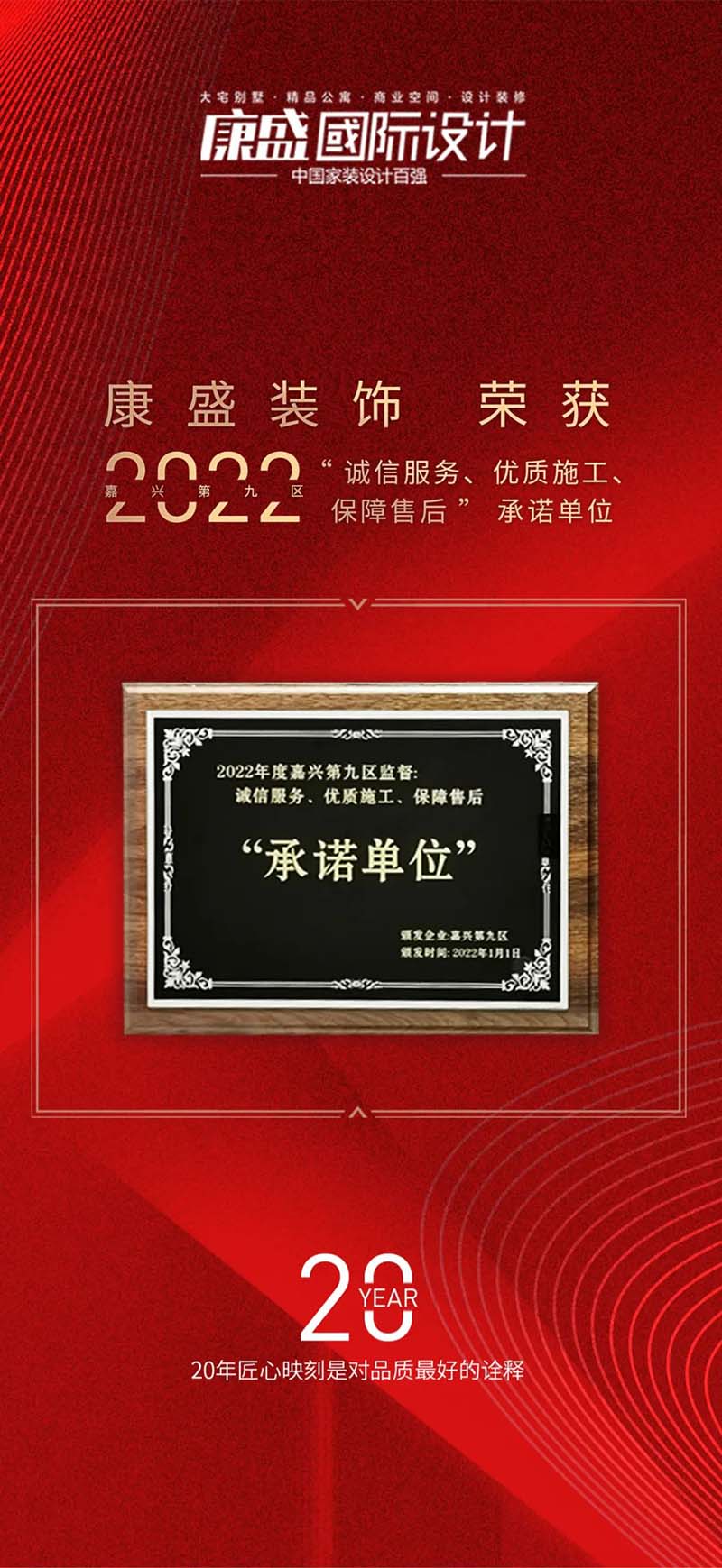 與此同時,嘉興第九區(qū)授予康盛裝飾“2022年度第九區(qū)誠信服務(wù)、優(yōu)質(zhì)施工、保障售后‘承諾單位'”。