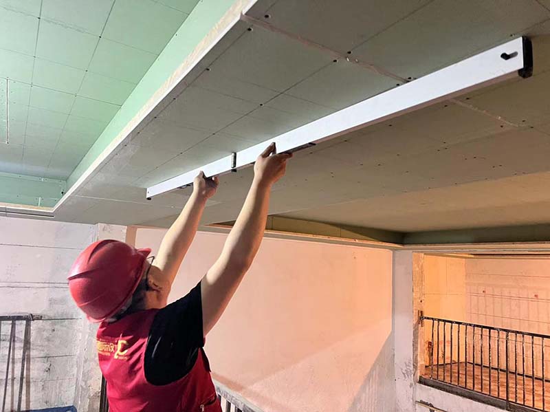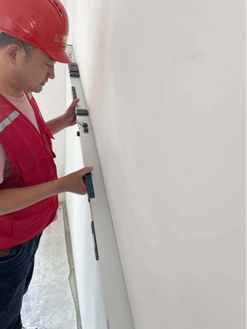 ▲檢測石膏板吊頂?shù)钠秸?/span>