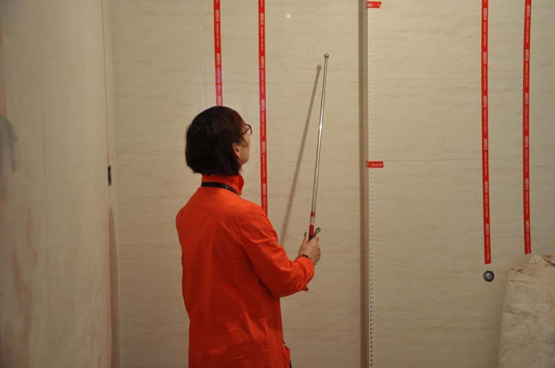 ▲王姐檢查衛(wèi)生間瓷磚空鼓情況