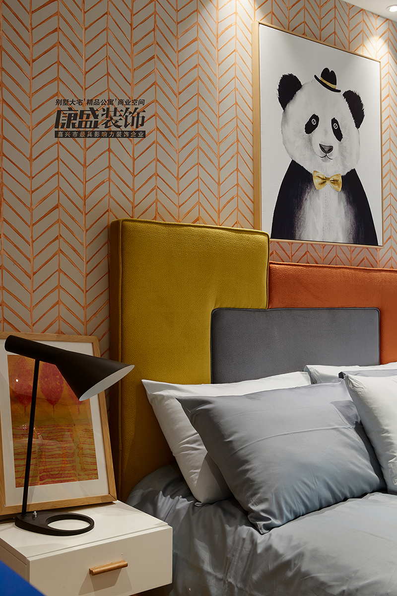 家具的選擇上,注重舒適度,采用布藝沙發(fā)加上亮色靠枕,在皮質(zhì)硬包的映襯下,更顯檔次與尊貴!兒童的成長環(huán)境要注重色彩搭配,桔色墻紙配合藍黃相間的體柜,給空間增添無限的遐想!