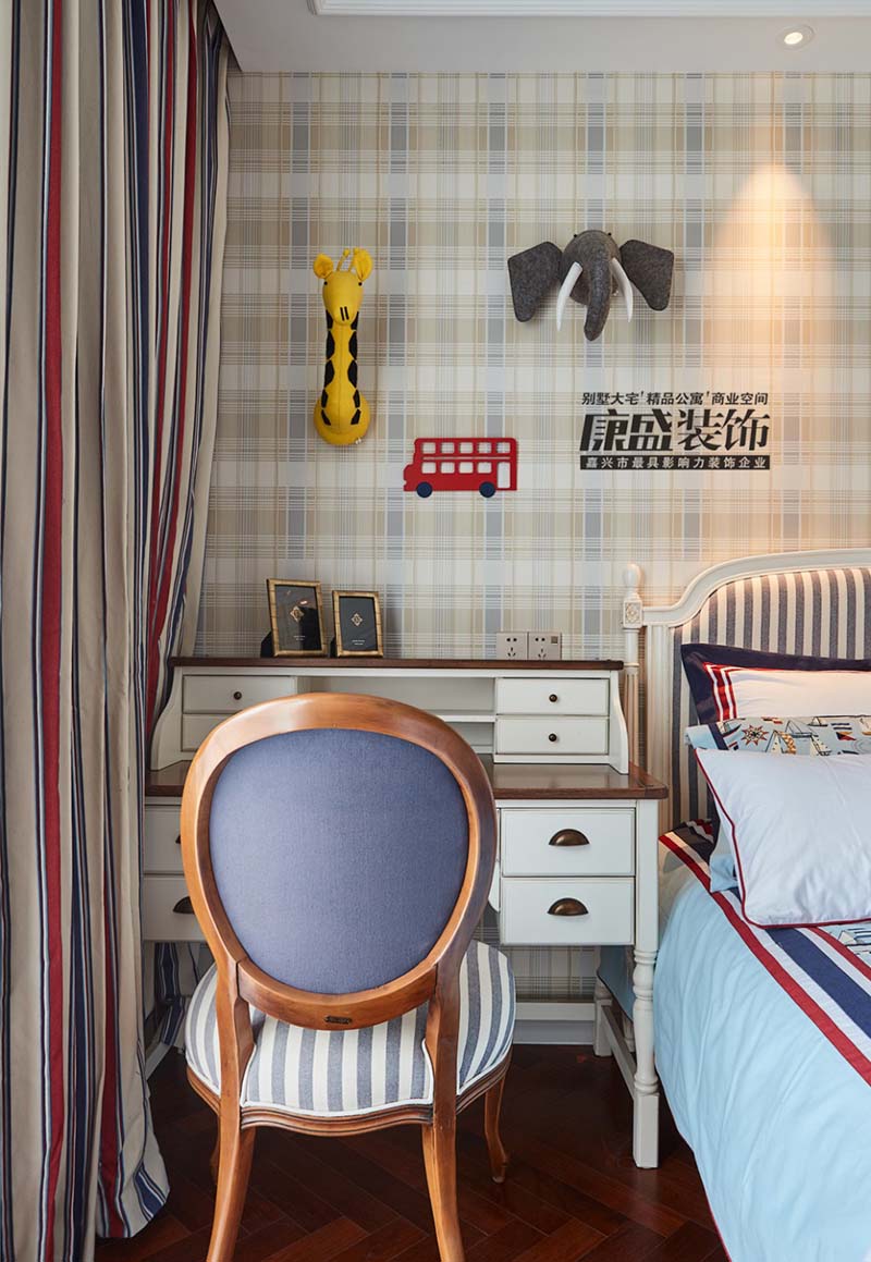 藍(lán)黃相間的布紋墻紙配與原木的美式家具,