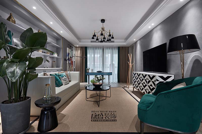 灰色的藝術(shù)漆墻面,在射燈的襯托下更顯大氣。銀色沙發(fā)、大面積的山水風(fēng)景圖、抽象彩色掛畫形成巨大沖擊力??兹妇G的座椅與抱枕相互輝映,給整體色調(diào)增加了一抹亮色。簡約而富有藝術(shù)氣息,一種凌駕于繁華之上的凝練之美,落落大方又不失獨(dú)特。