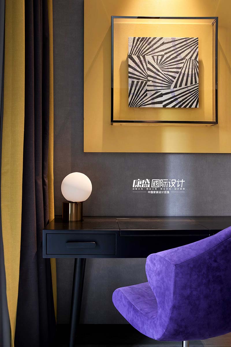 “灰色層染”的主題運(yùn)用了深灰、暗灰等不同層次與不同飽和度的灰色調(diào)給人營(yíng)造一個(gè)平靜溫和的居住氛圍。其間適時(shí)伴有亮色出現(xiàn)就像梵高所說,讓空間變得更完整,比如出現(xiàn)在餐廳的藝術(shù)掛畫。