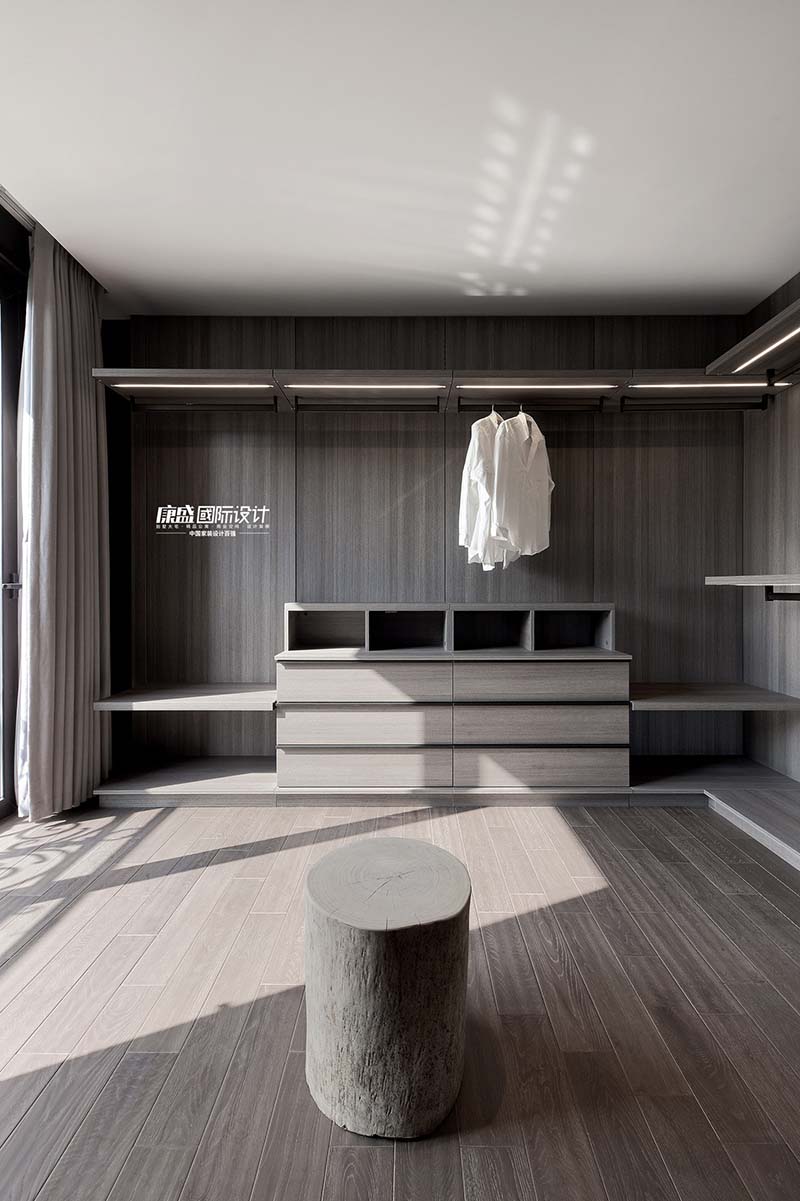 書房的左手邊是主臥,這是一個整體的大套間,寬敞的臥室和單獨的大衣帽間。打開主臥門的同時,相信你一定會被整面黑色但有肌理感的墻面所震撼,底口木飾面的抬高以及線性燈帶和墻面形成一個強(qiáng)烈的視覺,盡顯高級。