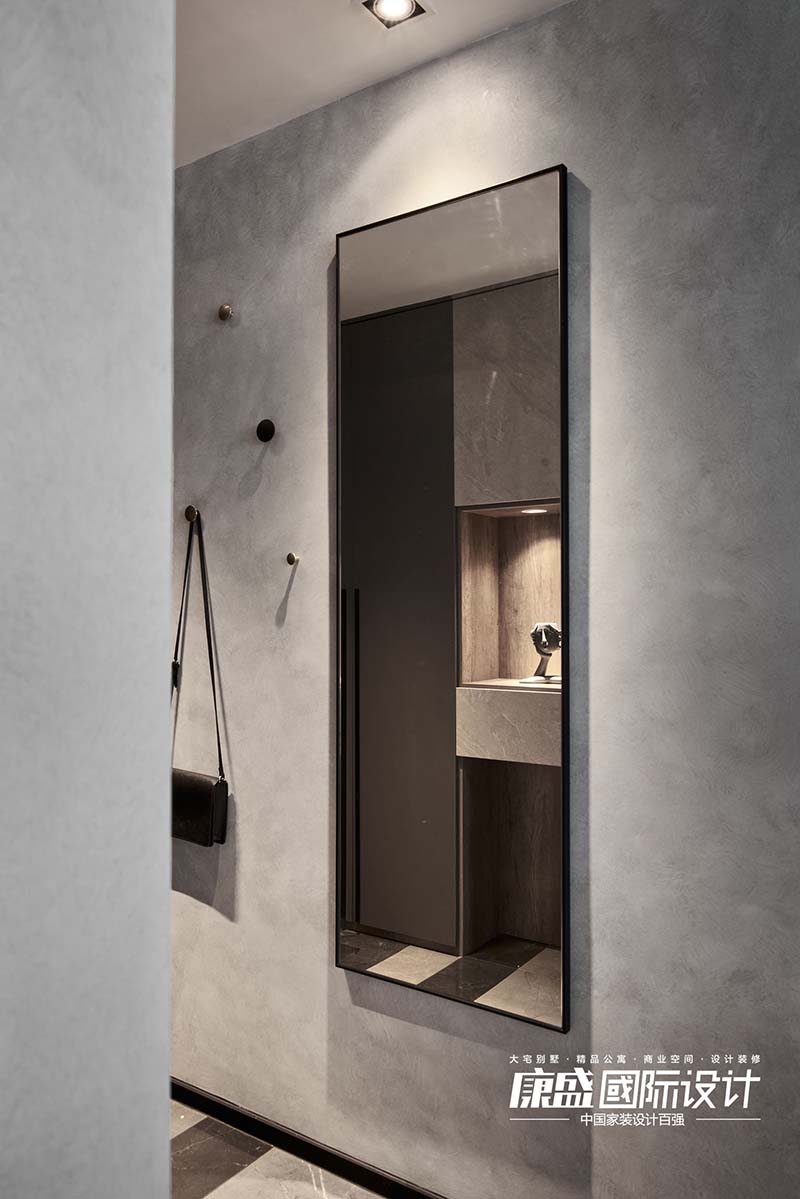 鞋柜和收納柜的一體和諧,構(gòu)筑一個(gè)完整光潔的立面,墻上加入的鏡面延伸空間深度,與燈光的交相輝映,保有充盈的美感。深色與淺色的地面形成強(qiáng)烈的對比,增強(qiáng)了空間的視覺張力。