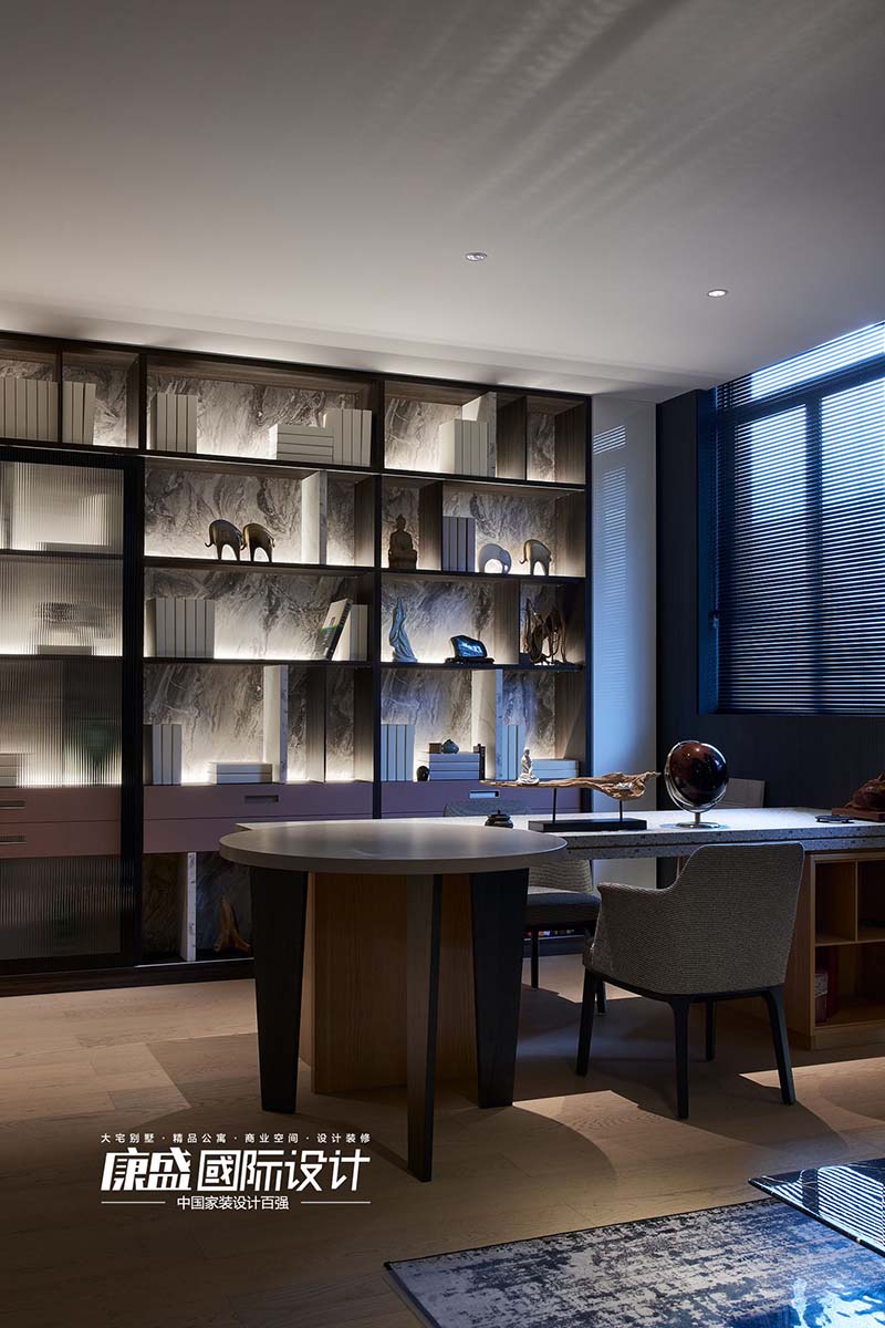 吧臺(tái)與書(shū)架相互呼應(yīng),二者形成一塊完整卻又獨(dú)立相呼應(yīng)的區(qū)域,兩者間的地面以大塊面的大理石磚分隔,自然流暢,簡(jiǎn)約大氣。