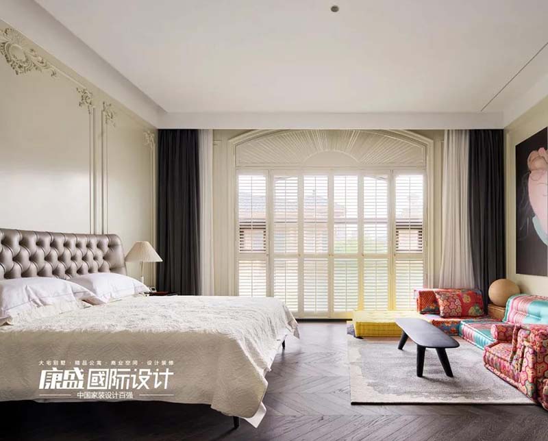 主臥采用了米色雕花護板裝修搭配有個性質(zhì)感的家具,配以羅奇堡麻將沙發(fā)進行點綴。