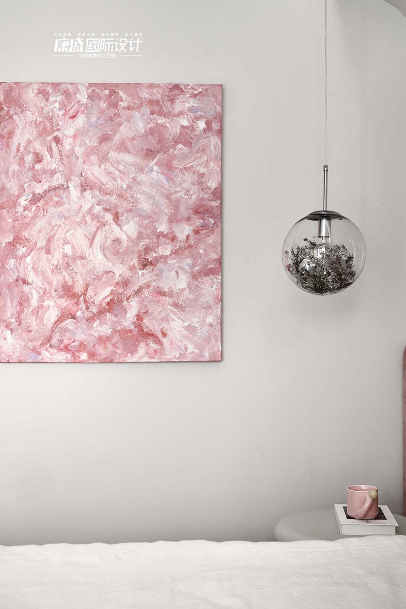無主燈設計,玻璃的吊燈和灰色床頭格柵
