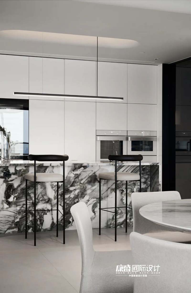 客廳、廚房、餐廳及公共區(qū)域,利用幾何學(xué)原理和光線之間的相互滲透形成了一個(gè)有機(jī)的、緊密的整體。