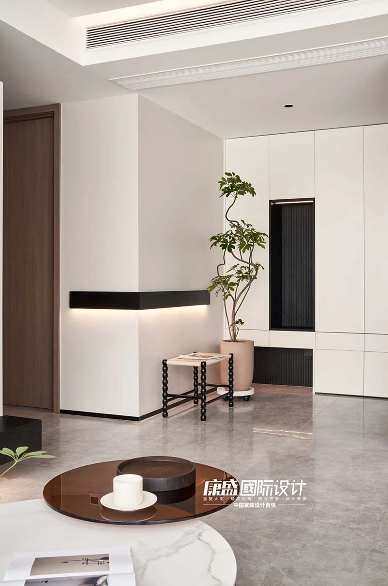 玄關(guān)旨在將功能實(shí)現(xiàn)最大化,通頂鞋柜+抽屜收納+換鞋凳,加以燈光和綠意做細(xì)節(jié)點(diǎn)綴。