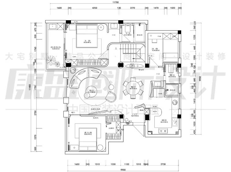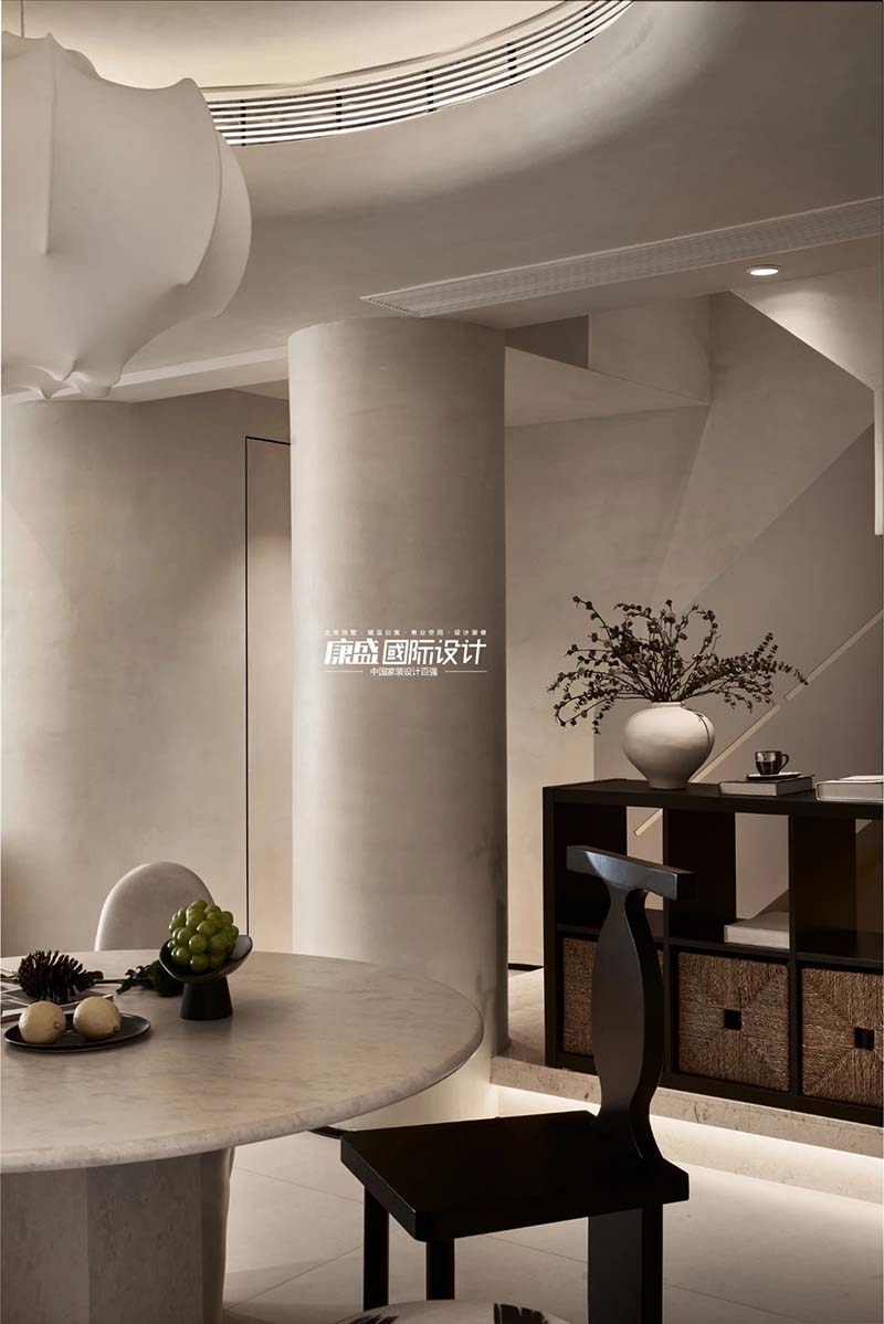 圓形餐桌呼應(yīng)吊頂形狀,形成空間整體感。