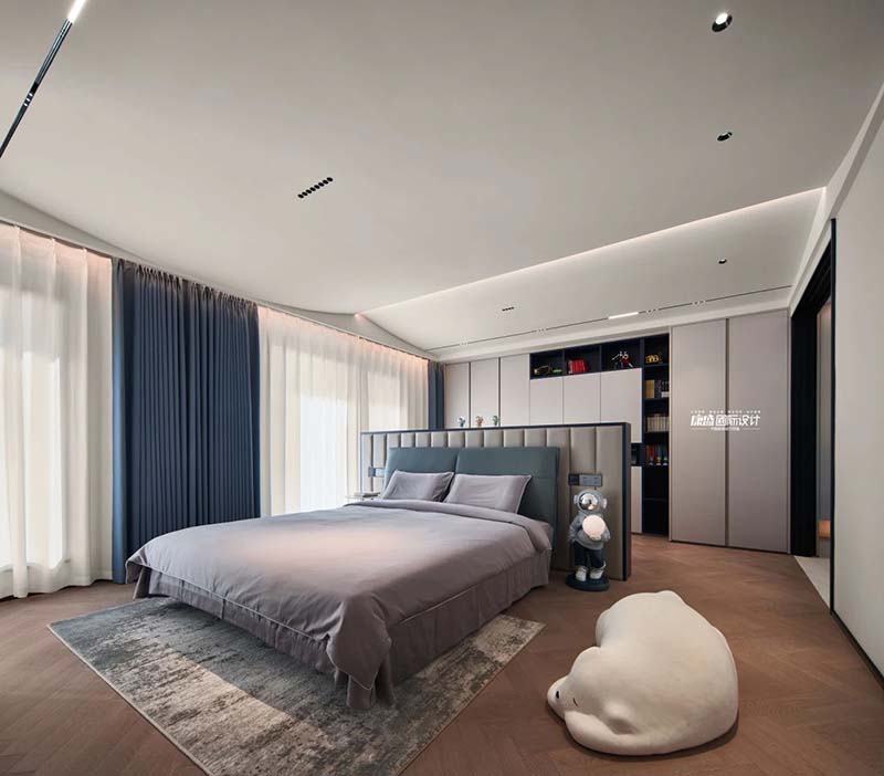 The overall space adopts a gentle white tone, creating a clean and minimalist sleeping environment. Coupled with embedded light strips, it adds warmth and enriches the layering of the large white wall.