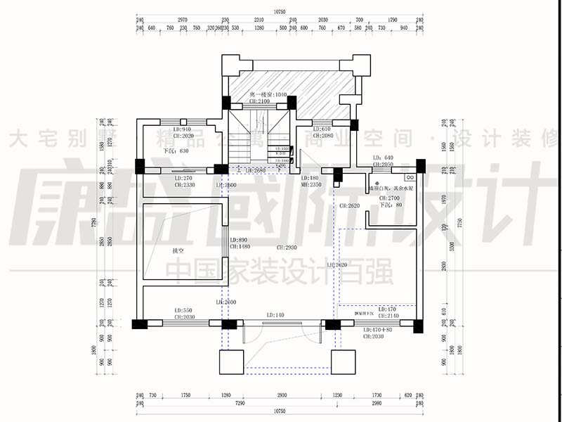 一樓的頂面是異形頂,在這個基礎上做了燈膜的設計,跟圓洞起了一個相互呼應的作用。從地下室的夾層往上看就會有視覺延伸的效果。