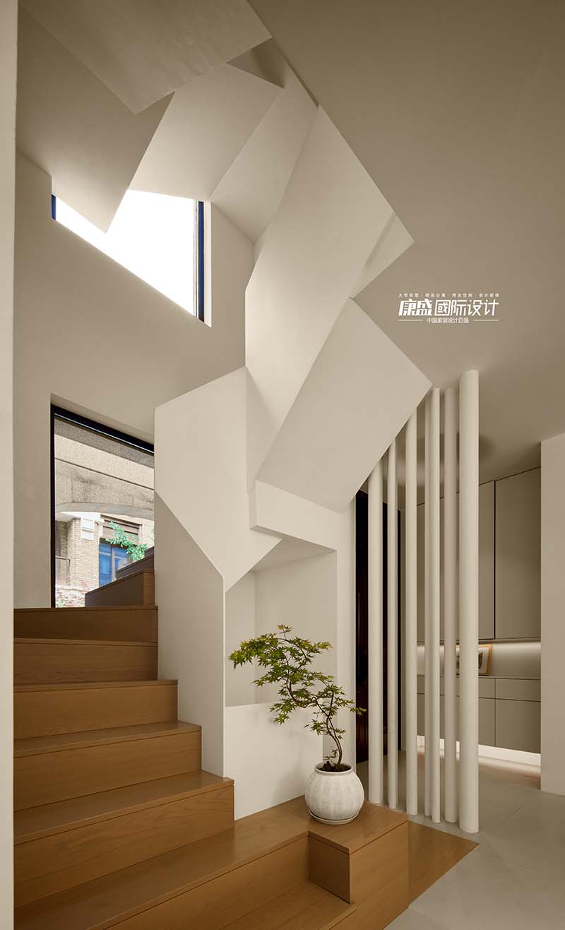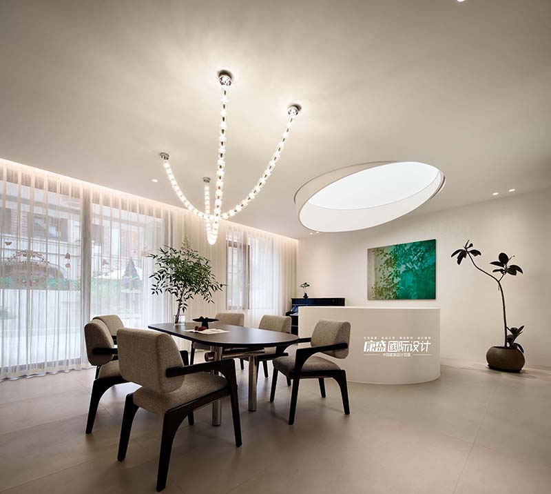 The top surface of the first floor is an irregular roof, on which a light film design was made to complement the circular hole. Looking up from the basement mezzanine, there will be a visual extension effect.
