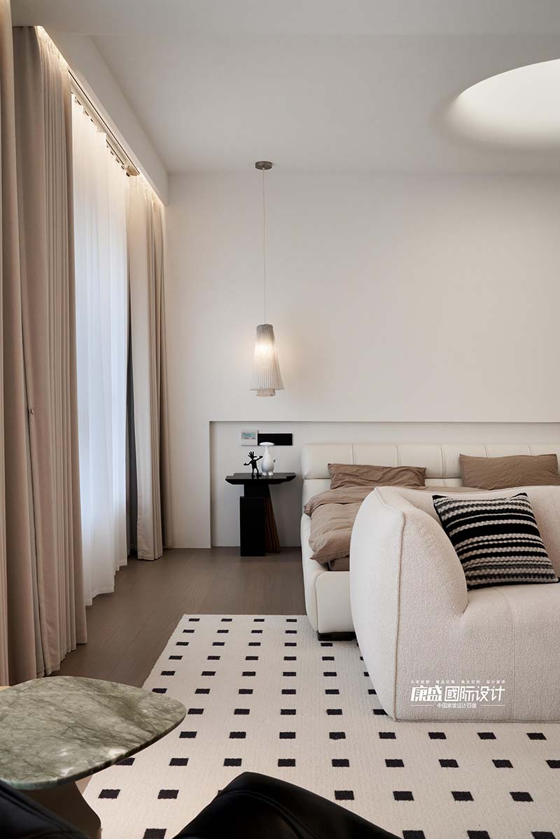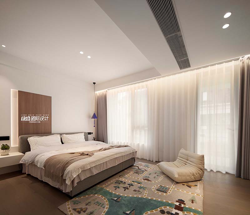 The color scheme of the master bedroom is mainly minimalist and clean, with a wooden space that makes people feel comfortable and relaxed. The just right touch of black in the space is like the finishing touch of a dragon painting, forming a sharp contrast with the overall atmosphere. The collision of these two creates a unique chemical reaction that complements each other, creating a comfortable and tasteful living space.