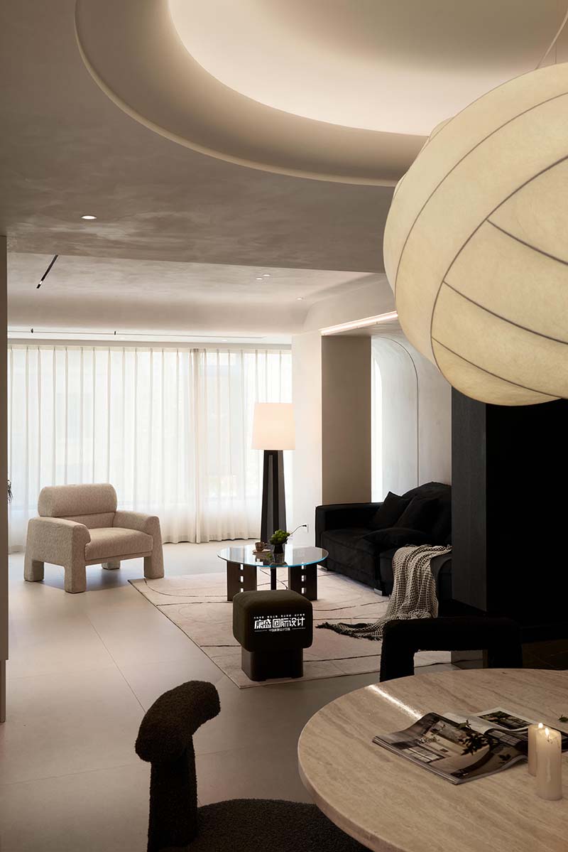 客廳的主色調(diào)為柔和的奶油白,搭配黑色的長沙發(fā)和墨綠色的椅子,形成了鮮明的色彩對比,墻面設計為不同的弧形木飾面,營造出獨特的居住氛圍。