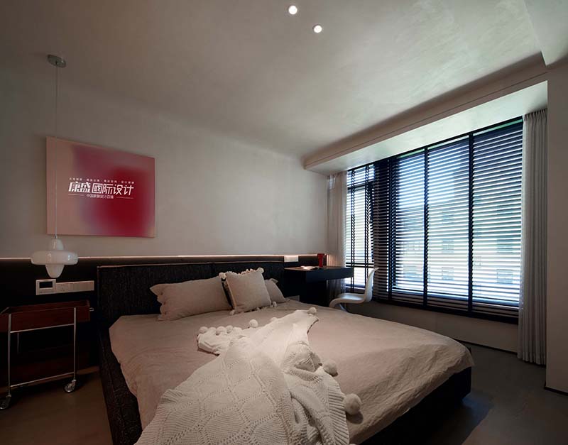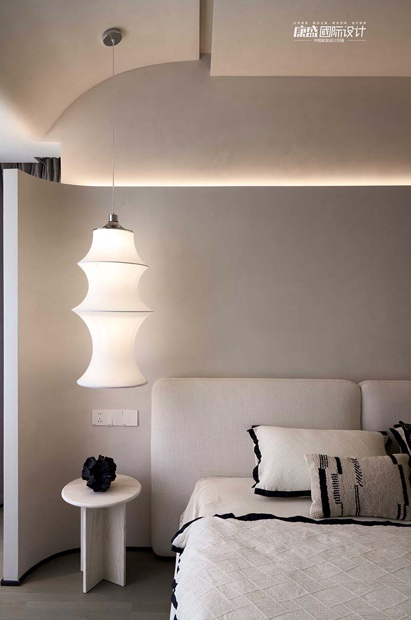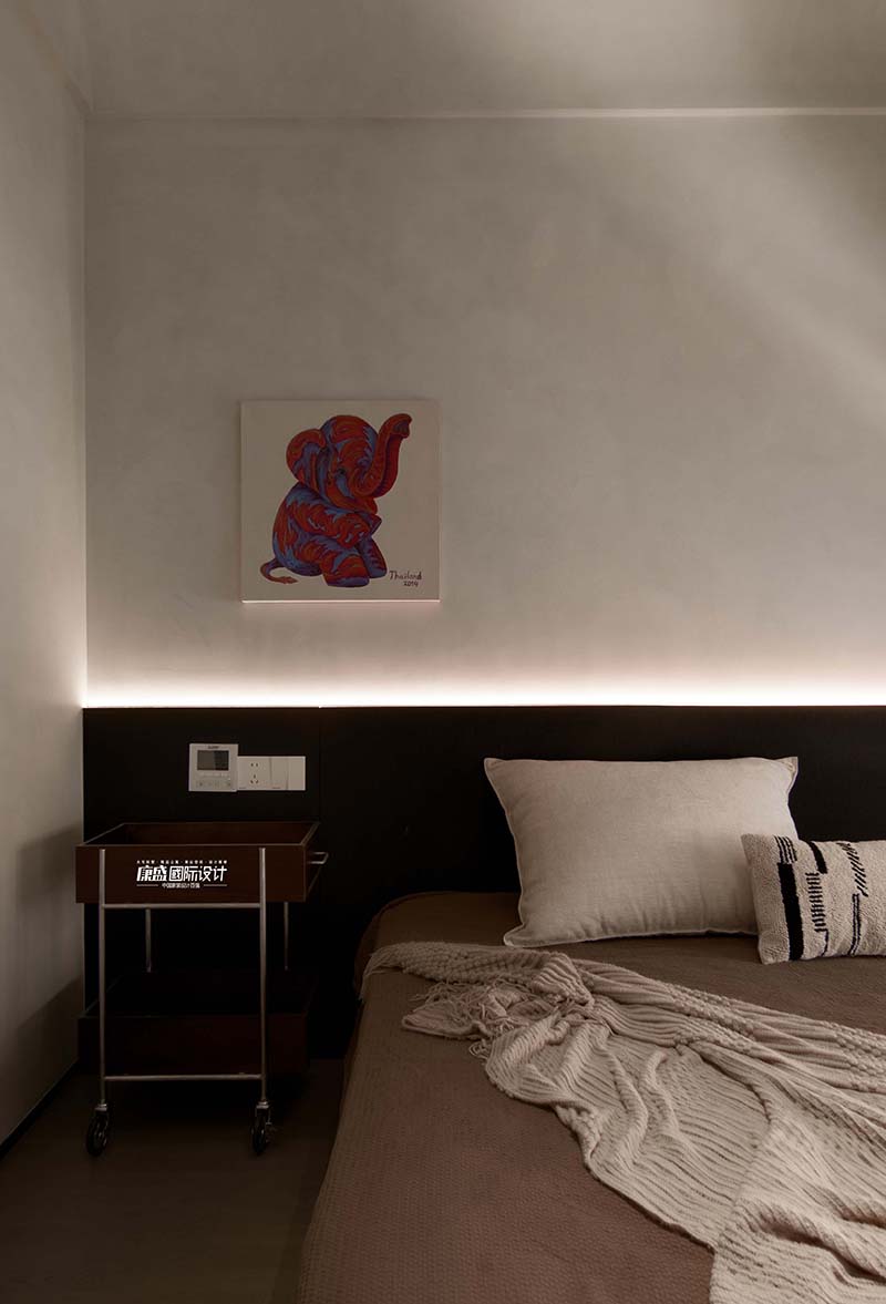 A spacious and comfortable bed is located in the center of the bedroom, with low saturation color bedding that complements the overall color scheme. Embedded light strip+pendant light, multiple light sources complement each other.