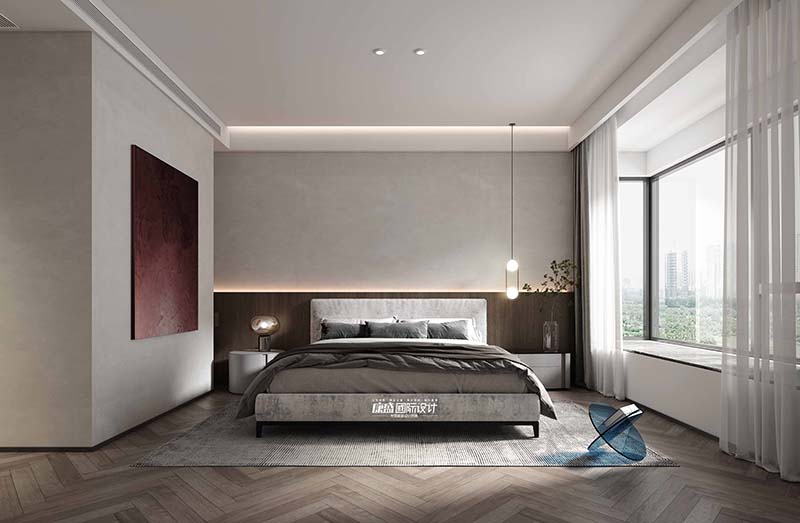 The wooden veneer decoration on the half wall of the bedroom has also become the background of the bed head, extending in a straight line to double the sense of space. The choice of bedding is a low saturation color scheme, which is warm and comfortable while maintaining overall consistency..