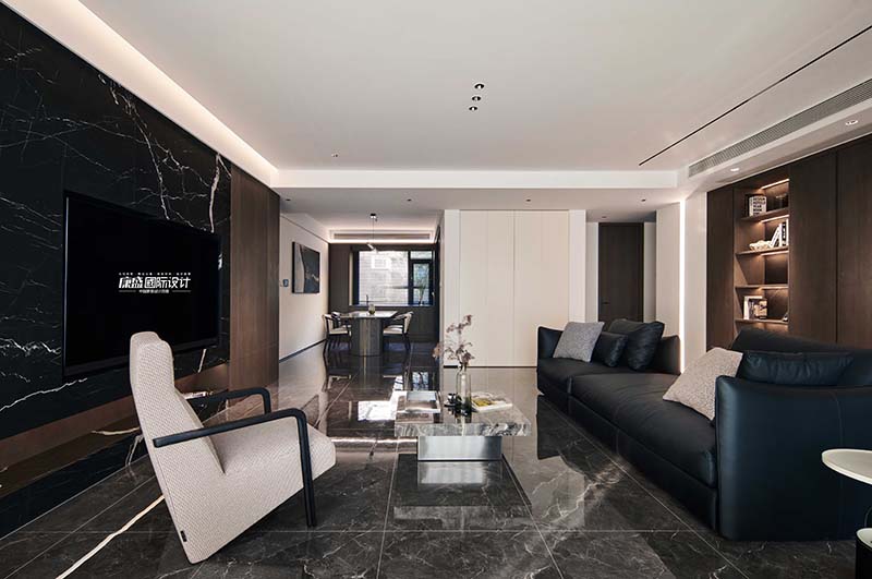 The main color scheme of the living room adopts coffee and black, using simple yet powerful lines and geometric shapes as design elements. The walls, cabinets, and floors are covered in large areas of coffee and black, creating the overall tone of the space. White was chosen for the ceiling and walls to enhance the brightness of the space.