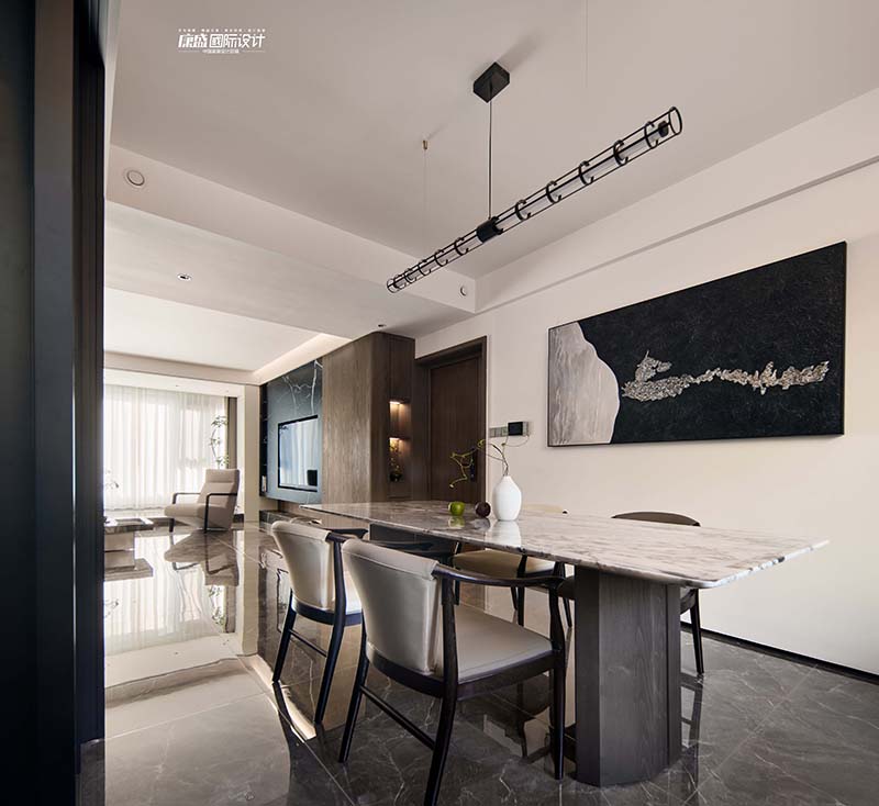A simple and atmospheric white patterned rock dining table, low saturation color leather dining chairs, paired with a black minimalist straight pendant light, with smooth lines, creates a strong dining atmosphere.