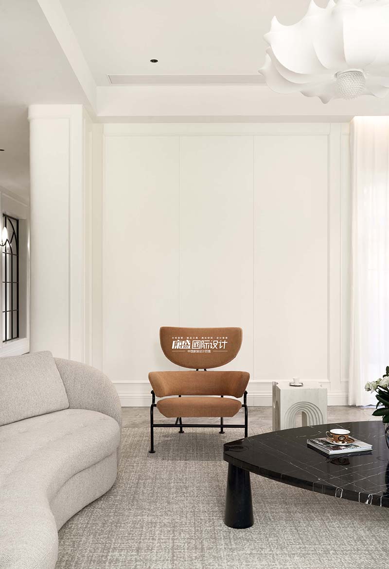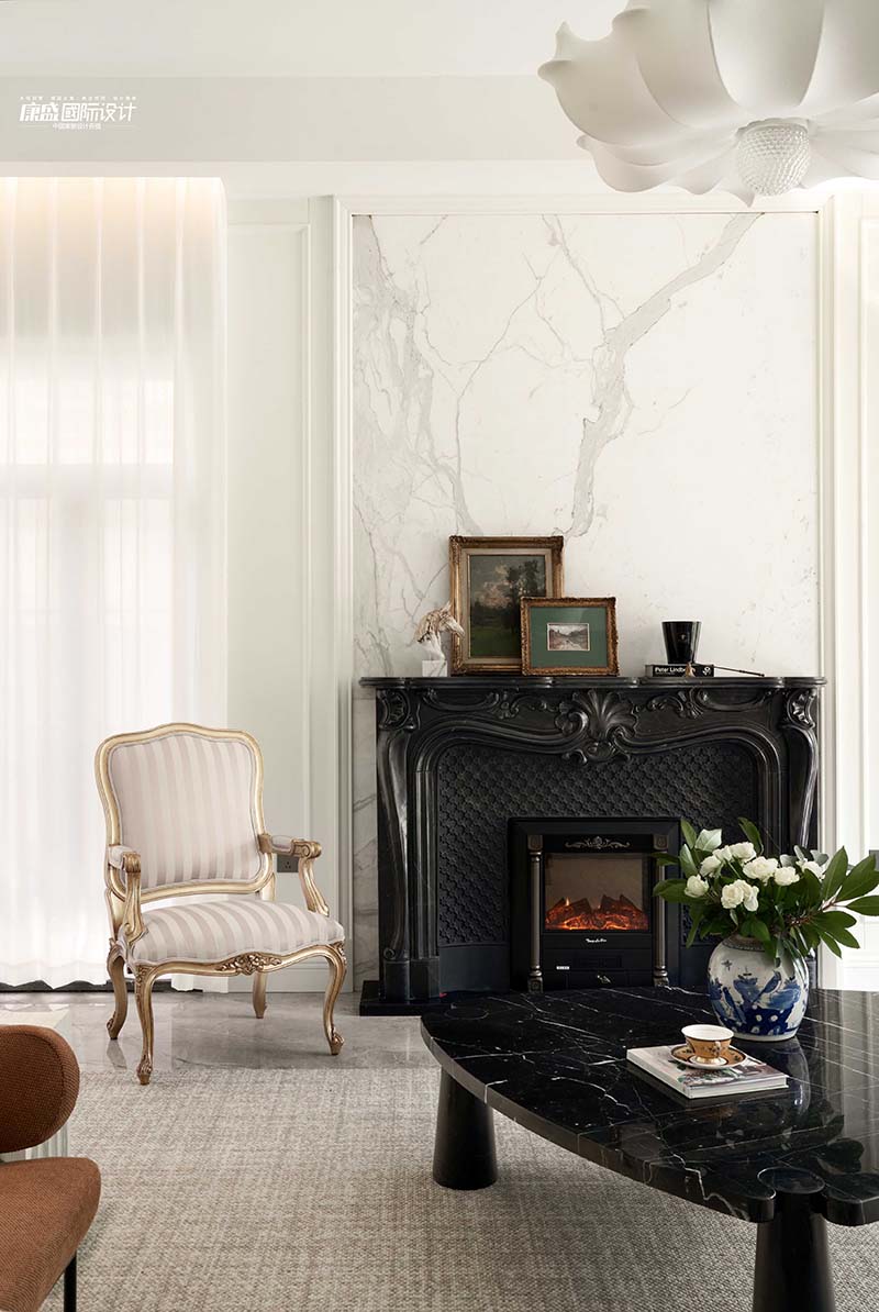 The living room features a perforated stone fireplace in the location of the original TV wall to create a French style atmosphere. On the one hand, the living room retains the core color matching and material selection of French style, while on the other hand, it abandons the overly complicated and grand design of classical French, and instead uses simple lines and gypsum lines to create the overall spatial style.