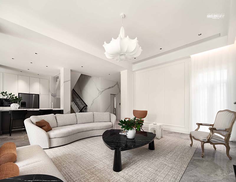 天花板處的水波紋吊頂以及拱門設(shè)計(jì),無(wú)疑是在簡(jiǎn)約的空間中“嵌入”了法式浪漫。圓弧形沙發(fā)圍合式放置,既與頂部凹進(jìn)去的圓形吊頂造型相呼應(yīng),又在開(kāi)放式空間中成為獨(dú)立的一個(gè)空間。場(chǎng)景與場(chǎng)景之間有交互,又保持相互獨(dú)立。各空間之間不設(shè)界限,區(qū)域分明,自成不同天地,形成空間獨(dú)特的場(chǎng)域。
