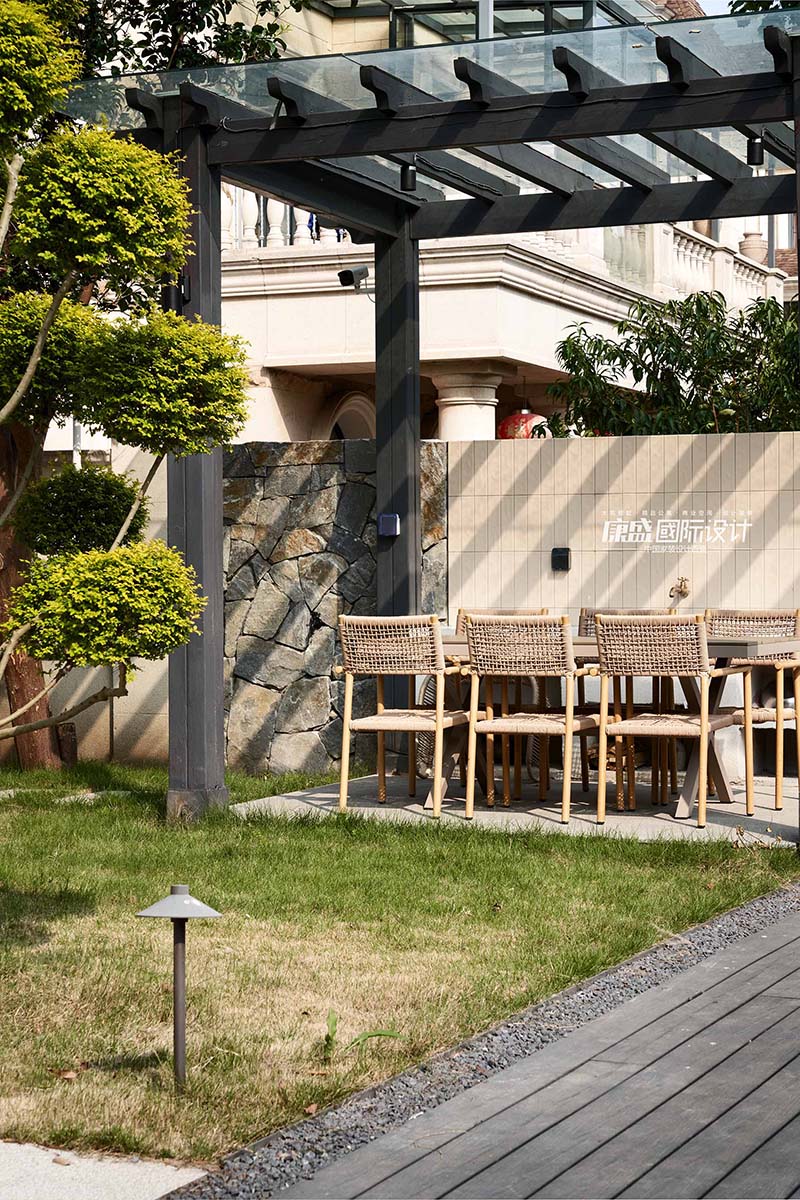 The yard is made of antiseptic wood flooring as a backing board, and the platform is divided by a trail, and various green plants, flowers and ponds are arranged on both sides of the platform, and the addition of natural elements of animals and plants not only beautifies the space, but also brings vitality and vitality to the courtyard. The relaxation area is equipped with comfortable wooden dining tables and chairs, and it is very comfortable to make tea around the stove and feel the natural landscape.