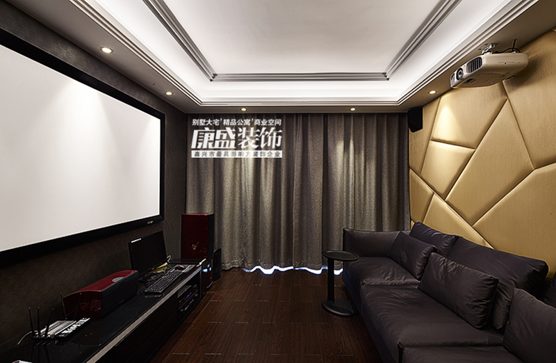 這套房子是一套平層和一套小復式打通而成,餐廳區(qū)是其中一套房子的客廳,墻面背景用爵士白大理石配合新古典的表現(xiàn)形式,結(jié)合銀色帶花墻紙和新古典家具營造出通透開闊的空間氛圍,客廳簡約現(xiàn)代風,通過客廳進入視聽室,視聽室整面都是金色不規(guī)則軟包,直接延伸到樓上兒子主臥,讓人有種虛幻的感覺。